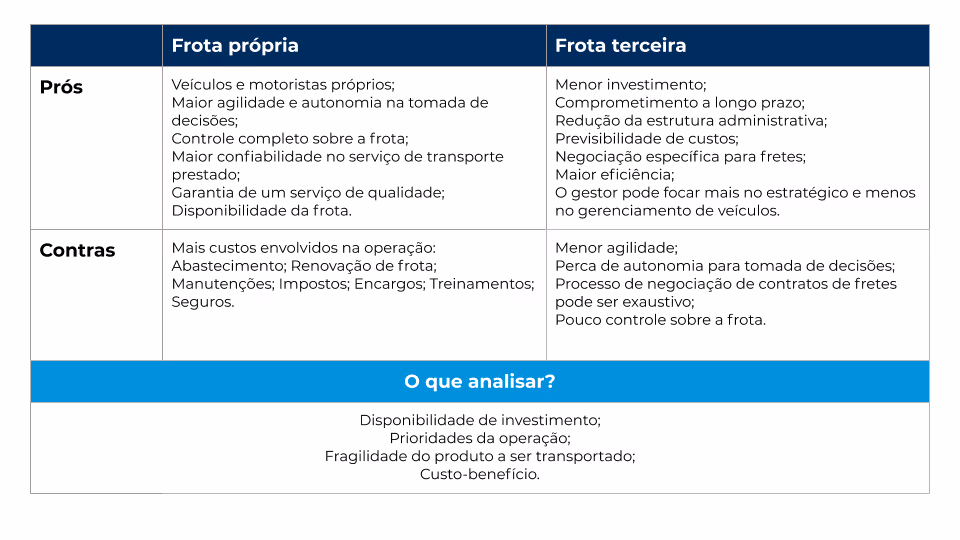 Como vimos, tanto a frota própria quanto a terceirizada tem seus prós e seus contras, Não se pode dizer que uma é pior ou melhor que a outra, pois isso depende muito do tipo de operação de cada empresa.